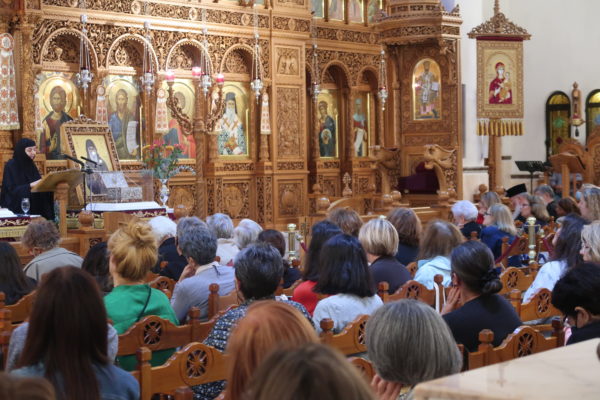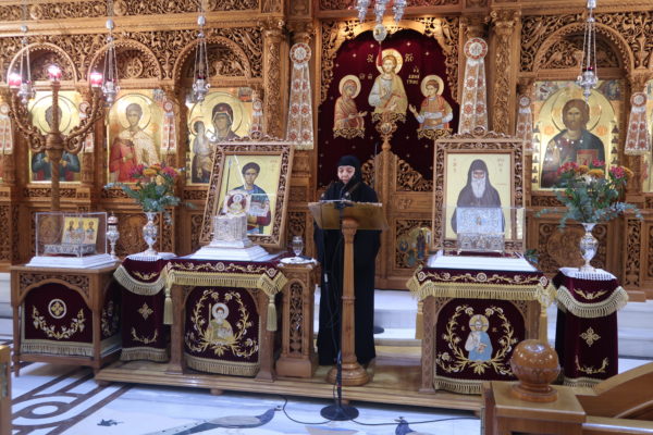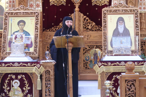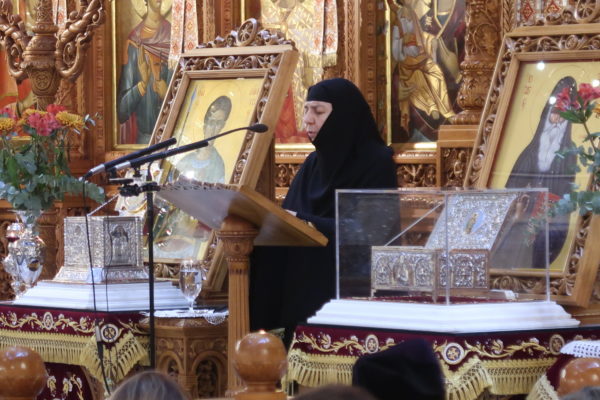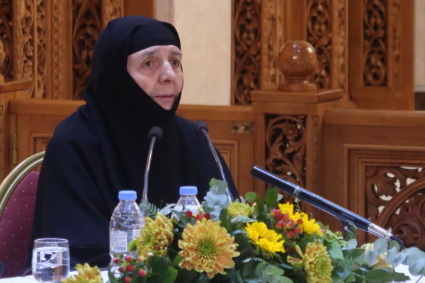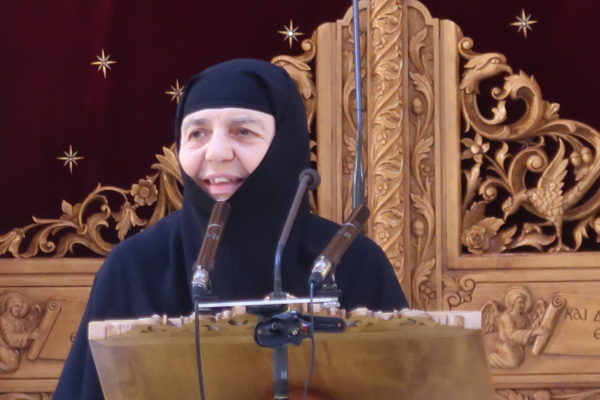 Η Γερόντισσα στην εμπνευσμένη ομιλία της είπε χαρακτηριστικά: «Σκοπός και ουσία της ειρήνης είναι η ενότητα και η αλληλοπεριχώρηση, όπως αυτή μεταδίδεται μέσα από το βίωμα και τη διδασκαλία των Αγίων της Εκκλησίας. Με τη συνειδητή συμμετοχή στη λατρεία, με την ασκητική και ευχαριστιακή χρήση του κόσμου, με τη συνεχή και άγρυπνη προσευχή για την παγκόσμια αποστασία από το θέλημα του Θεού, με τη συντριβή της καρδιάς και τη διαρκή εκζήτηση του ελέους του Θεού για τον εαυτό μας και για τον πλησίον, όσο κι αν αυτός μας δυσκολεύει, έρχεται η ειρήνη στο πνεύμα, μαζί με την αφοβία για την αδικία και ταραχή του ανειρήνευτου κόσμου στον οποίο ζούμε. Έτσι, με τη χάρη του Θεού, μπορεί να υπερβαίνεται η απελπισία για τη ματαιότητα των πρόσκαιρων και να εδραιώνεται στις καρδιές των ανθρώπων και στον σύμπαντα κόσμο η αυθεντική ειρήνη, που είναι πρόγευση του μέλλοντος αιώνος».
