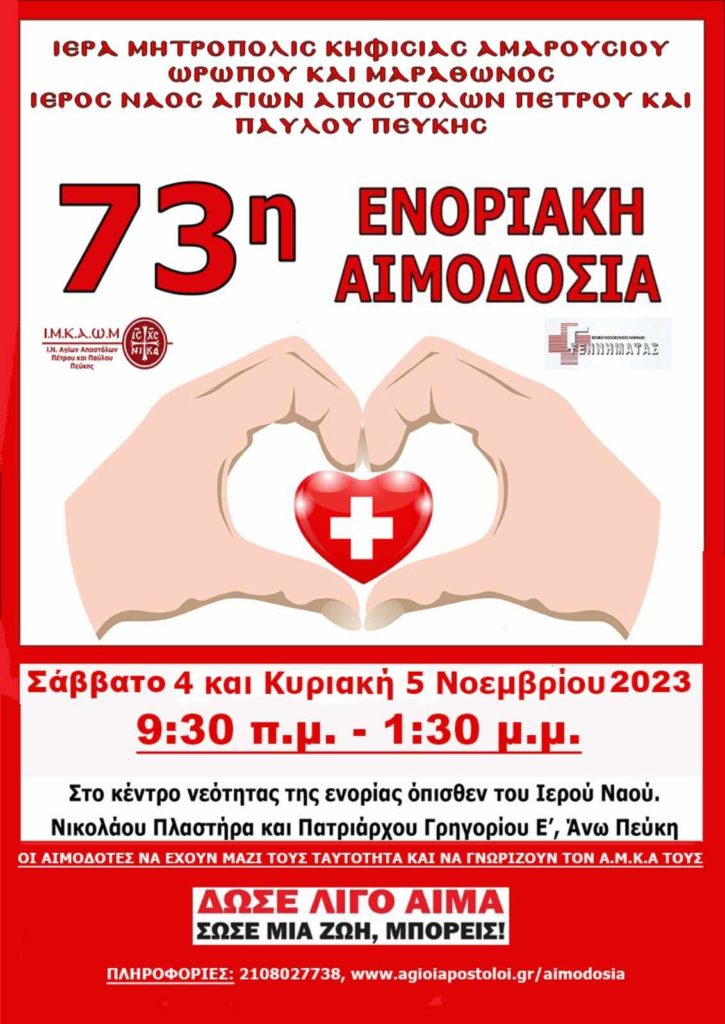 Με σύνθημα «Δώσε λίγο αίμα – Σώσε μία ζωή- Μπορείς!», το Σάββατο 4 και την Κυριακή 5 Νοεμβρίου, από τις 9:30 έως τις 13:30, θα πραγματοποιηθεί η 73η ενοριακή αιμοδοσία, στο κέντρο νεότητας της ενορίας όπισθεν του Ιερού Ναού Αγίων Αποστόλων Πέτρου και Παύλου Πεύκης.