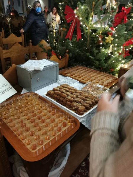 Στην ακολουθία παρευρέθηκαν πιστοί και ενορίτες οι οποίοι στο τέλος τις ακολουθίας κεράστηκαν νηστίσιμα χριστουγεννιάτικα γλυκά.