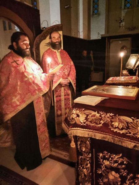 Την ακολουθία τέλεσαν οι ιερείς του ναού , ο προϊστάμενος Αρχιμανδρίτης Μακάριος Τσιμέρης και ο εφημέριος Πρωτ. Θεοδόσιος Αργυρόπουλος.