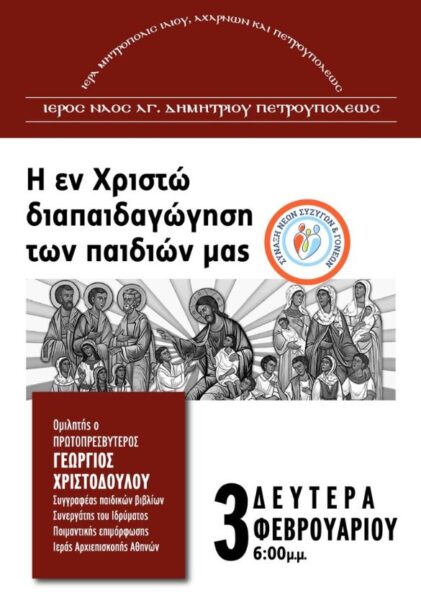 Τη Δευτέρα 3 Φεβρουαρίου 2020 και ώρα 18:30 θα πραγματοποιηθεί στον Ιερό Ναό Αγίου Δημητρίου Πετρουπόλεως ομιλία στο πλαίσιο της σύναξης νέων συζύγων και γονέων της ενορίας. Θα μιλήσει ο πρωτοπρεσβύτερος Γεώργιος Χριστοδούλου με θέμα «Η εν Χριστώ διαπαιδαγώγηση των παιδιών μας».