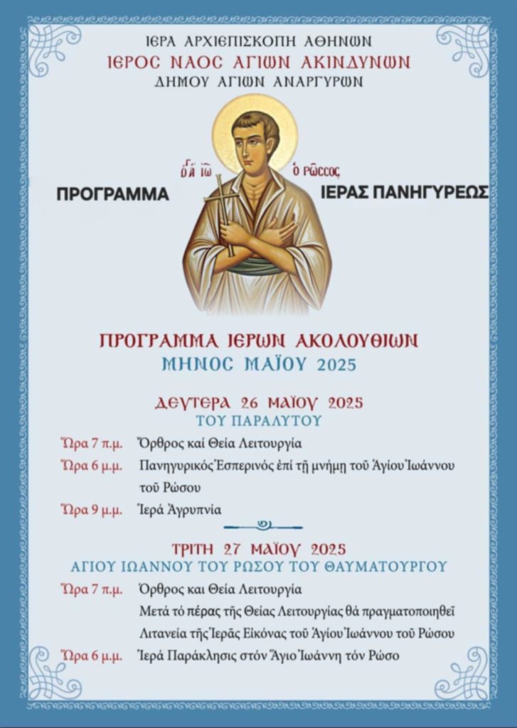 Την ιερά μνήμη του Οσίου Ιωάννου του Ρώσσου θα τιμήσει η ενορία των Αγίων Ακινδύνων Δήμου Αγίων Αναργύρων της Ιεράς Αρχιεπισκοπής Αθηνών. Οι ιερές ακολουθίες θα πραγματοποιηθούν σύμφωνα με το ακόλουθο πρόγραμμα: