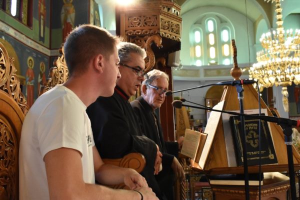 Τις ιερές ακολουθίες πλαισίωσαν ψαλμωδίες από τους Ιεροψάλτες του Ιερού Ναού τον κ. Παρασκευά Λεκατσά, τον κ. Θεόδωρο Φραδέλο και τον αναγνώστη του Ιερού Ναού κ. Αναστάσιο Μίχο