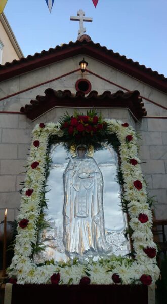 Το εσπέρας της εορτής τελέσθηκαν οι Ιερές Ακολουθίες του Αγιασμού, του Εσπερινού και της Ιεράς Παρακλήσεως προς τιμήν της Αγίας.