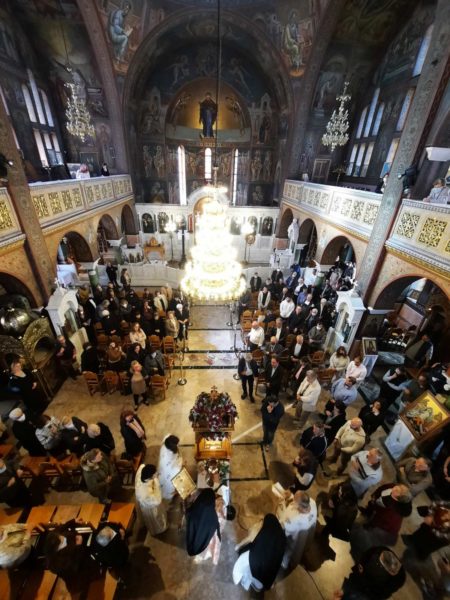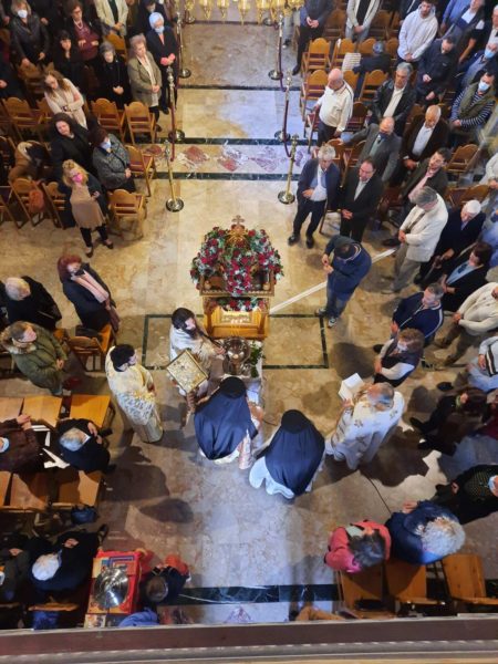 Την κυριώνυμη ημέρα, Κυριακή 7 Μαϊου, τελέσθηκε πανηγυρική Θεία Λειτουργία προεξάρχοντος του Πανοσιολογιωτάτου Αρχιμανδρίτου π. Νήφωνος Καπογιάννη, Πρωτοσυγκέλλου της Ιεράς Μητροπόλεως Πειραιώς, ο οποίος κατά το κήρυγμά του αναφέρθηκε στον πνευματικό αγώνα του Αγίου Νείλου εναντίον των παθών της φιληδονίας, της φιλαργυρίας και της φιλαυτίας καθώς και στην μυροβλυσία του οσιακού σκηνώματός του.
