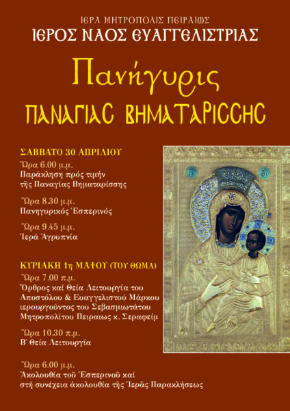 Την Παναγία την Βηματάρισσα τιμά ο Ιερός Ναός Ευαγγελίστριας Πειραιώς το Σαββατοκύριακο της Διακαινησίμου (30 Απριλίου – 1η Μαΐου), αφού την εβδομάδα αμέσως μετά την Κυριακή του Πάσχα τιμάται η Θεοτόκος, που είδε τον υιό της και υιό του Θεού να σταυρώνεται και να ανασταίνεται!
