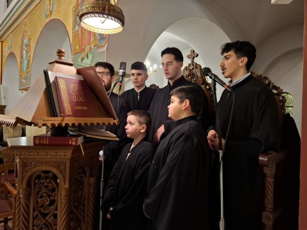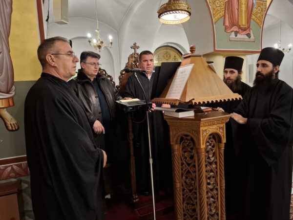 Τους ύμνους απέδωσαν χορός ιεροψαλτών με χοράρχες τον Πρωτοψάλτη του ιερού ναού κ. Γεώργιο Μαρίνη και τον Λαμπαδάριο κ. Νεκτάριο Γεραμάνη υιό του εφημέριου του ιερού ναού.