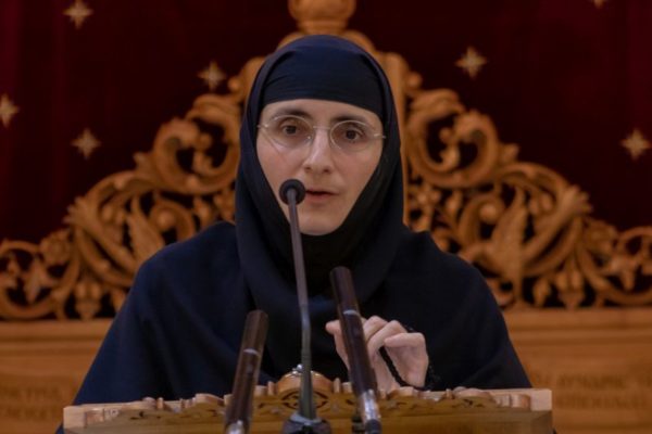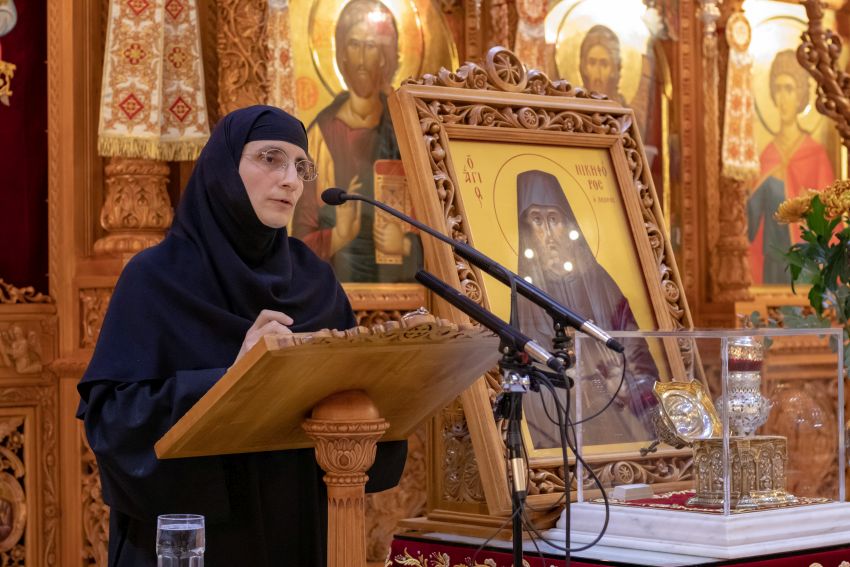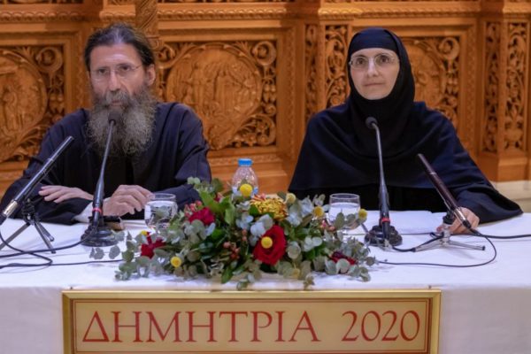 Ακολούθησε η προγραμματισμένη ομιλία από την Οσιολογιωτάτη Γερόντισσα Φιλοθέη, Ηγουμένη της Ιεράς Μονής Παναγίας Βρυούλων. Θέμα της ομιλίας ήταν: “Καθημερινός αγώνας ανάμεσα σε καλούς και κακούς λογισμούς”.
