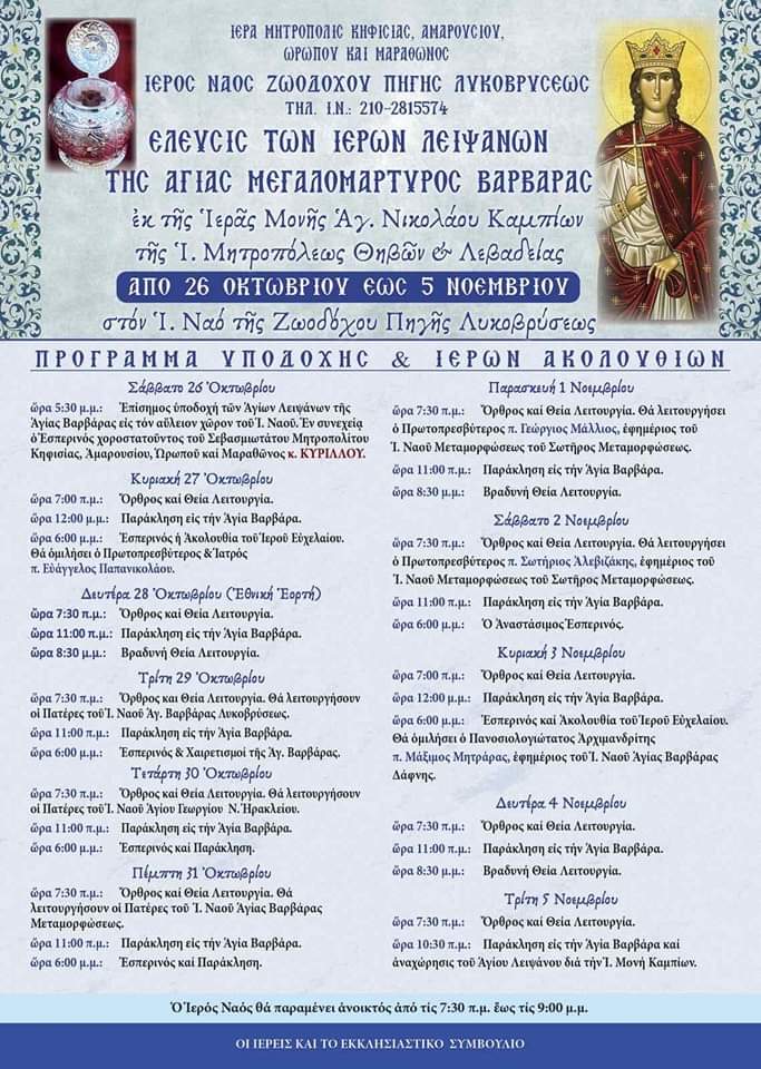 Η Λυκόβρυση θα έχει την ευλογία να υποδεχθεί τα Ιερά Λείψανα της Αγίας Μεγαλομάρτυρος Βαρβάρας από την Ιερά Μονή Αγίου Νικολάου Καμπίων της Ιεράς Μητροπόλεως Θηβών και Λεβαδείας το Σάββατο 26 Οκτωβρίου 2024 στις 5:30 το απόγευμα.