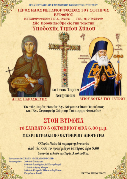 Τεμάχιο του Τιμίου Ξύλου καθώς επίσης και τα Ιερά λείψανα της Αγίας Παρασκευής και του Αγίου Λουκά του Ιατρού θα υποδεχτεί, το Σάββατο 5 Οκτωβρίου στις 6 το απόγευμα, η ενορία της Μεταμορφώσεως του Σωτήρος Βύρωνος.