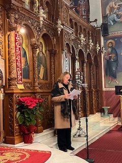 Προ της Θείας Κοινωνίας, η καθηγήτρια του Γυμνασίου κα Πολυμέρου Δήμητρα ανέγνωσε το εγκύκλιο σημείωμα της Ιεράς Συνόδου της Εκκλησίας της Ελλάδος προς τα παιδιά και τους εκπαιδευτικούς, μεταφέροντας τα διαχρονικά μηνύματα των Αγίων Τριών Ιεραρχών για την αξία της παιδείας και της πνευματικής καλλιέργειας.