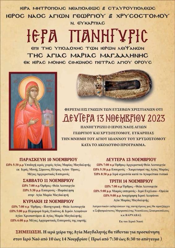 Στο πλαίσιο της πανηγύρεως, την Παρασκευή 10 Νοεμβρίου 2023 στις 5:30 το απόγευμα, ο Ιερός Ναός θα έχει την ευλογία να υποδεχθεί την ιερά χείρα της Αγίας Μαρίας Μαγδαληνής από την Ιερά Μονή Σίμωνος Πέτρας Αγίου Όρους.
