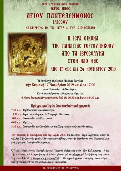 Η Παναγία η Γοργοϋπήκοος από τα Ιεροσόλυμα στον Ιερόν Ναόν Αγίου Παντελεήμονος Ιλισσού από 17 έως 24 Νοεμβρίου 2019.