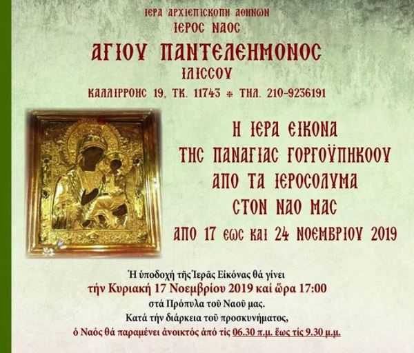 Η Παναγία η Γοργοϋπήκοος από τα Ιεροσόλυμα στον Ιερόν Ναόν Αγίου Παντελεήμονος Ιλισσού από 17 έως 24 Νοεμβρίου 2019.