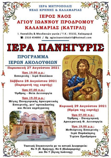 Με αφορμή την εορτή του Αγίου Ιωάννη του Προδρόμου θα εορτάσει την Ιερά Πανήγυρη ο φερώνυμος ναός στην περιοχή Κατιρλί Καλαμαριάς, στην Ιερά Μητροπόλη Καλαμαριά.