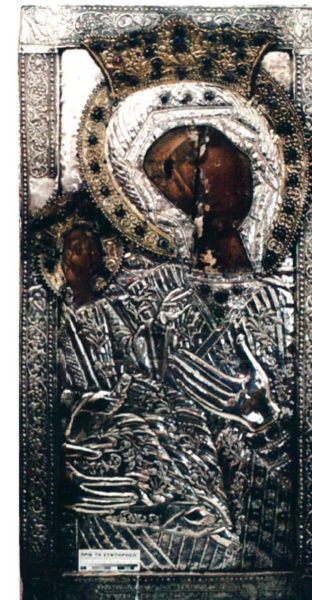 Εντός του Ιερού Ναού, εν ευλαβεία φυλάσσεται και δεόντως τιμάται, περίπυστος και επιβλητική ιερά εικόνα της Παναγίας της Βρεφοκρατούσης ή αλλιώς της Κυράς, της Χρυσοπολίτισσας κατ’ άλλους λόγω προέλευσης εκ της ΚΠολης, αλλά θα πρόσθετα και «Εσφαγμένης» δεδομένου ότι φέρει σημάδι από «τσεκουριά».