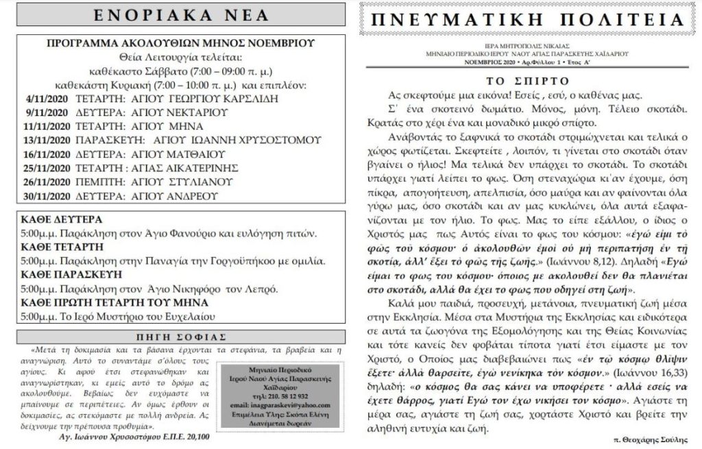 Με βασικό θέμα τη θλίψη και την πνευματική αντιμετώπισή της κυκλοφόρησε το μηνιαίο περιοδικό του Ιερού Ναού Αγίας Παρασκευής Χαϊδαρίου. Στη στήλη «Πνευματική Πολιτεία» μπορείτε να διαβάσετε «Το Σπίρτο», ένα κείμενο για το πώς το φως φωτίζει τα σκοτάδια μας, ενώ στη στήλη η «Φωνή των Πατέρων» υπάρχει απόσπασμα από το βιβλίο «Χειραγωγία στην Πνευματική Ζωή», με τίτλο: «Οι θλίψεις του κόσμου», Οσίου Θεοφάνους του Εγκλείστου. Επίσης, στη στήλη «Με τους Αγίους μας» μπορείτε να διαβάσετε το βίο του Αγίου Γεωργίου του Καρσλίδη από τον Πόντο.