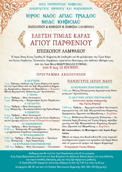 Την Τιμία Κάρα του Αγίου Παρθενίου, Επισκόπου Λαμψάκου, θα υποδεχτεί ο Ιερός Ναός Αγίας Τριάδας Νέας Κηφισιάς την Δευτέρα 6 Ιουνίου και ώρα 7 το απόγευμα.