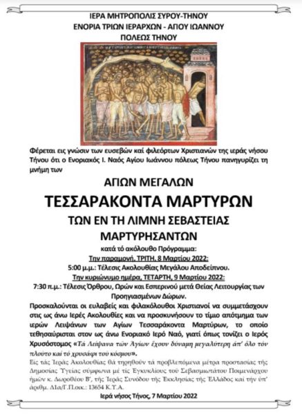 Τη μνήμη των Αγίων Μεγάλων Τεσσαράκοντα Μαρτύρων των εν τη Λίμνη Σεβαστείας Μαρτυρησάντων πανηγυρίζει από σήμερα το απόγευμα ο Ενοριακός Ι. Ναός Αγίου Ιωάννου πόλεως Τήνου κατά τό ακόλουθο πρόγραμμα: