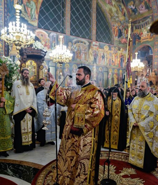 «Με πολλή συγκίνηση και με αληθινά μεγάλη χαρά διά των σεπτών χειρών του Αρχιγραμματέως της Ιεράς Συνόδου της Εκκλησίας της Ελλάδος, Πανοσιολογιωτάτου Αρχιμανδρίτου αδελφού και συλλειτουργού π. Ιωάννου Καραμούζη, προσεκομίσθη η χείρ του πρώτου μεγάλου ελληνομαθούς Ιεράρχου της Εκκλησίας μας, Βασιλείου του Μεγάλου, στον πανηγυρίζοντα Ναό μας του Αγίου Ελευθερίου – οδού Αχαρνών προς θείαν βοήθειαν και ενίσχυσιν, προς στήριξιν και παρηγορίαν στις κρίσιμες αυτές ημέρες, για να εορτάσουμε το ιερό αυτό τριήμερο όλοι ομού στον πανηγυρίζοντα τούτον Ναό, του επί κεφαλής της Η΄Αρχιεπισκοπικής Περιφέρειας. Να ευχαριστήσω τόσο τον π. Ιωάννη Καραμούζη, Αρχιγραμματέα της Ιεράς Συνόδου της Εκκλησίας της Ελλάδος που υποβλήθηκε στον κόπο αυτόν με την πατρική του αγάπη και την σιωπώσα στιβαρή προσωπικότητά του, όσο και τον Προιστάμενο του Ιερού Ναού, ο οποίος είχε αυτήν την τόσο εμπνευσμένη πρωτοβουλία να μας δώση αυτήν την χαρά και την μεγάλη ευλογία. Ως Περιφερειάρχης της Η΄ Αρχιεπισκοπικής Περιφέρεια καθηκόντως ήλθα και εγώ να υποβάλω την μετάνοιά μου στο χέρι αυτό που έγραψε τόσα και τόσα, στο χέρι αυτό που ευλόγησε, στο χέρι αυτό που χειροτόνησε, στο χέρι αυτό που χειροθέτησε, στο χέρι αυτό που αγίασε, στο χέρι αυτό που ελέησε δημιουργώντας την πρώτη μεγάλη φιλανθρωπική μονάδα της Εκκλησίας μας και έξακολουθεί εκπέμποντας σε όλους τους πιστούς την Χάρη του Αγίου Πνεύματος να προσφέρη ευλογία και άνωθεν παρηγορία. Με αυτή την ιερή και ευλογημένη είσοδο του Μεγάλου Βασιλείου, ενός εκ των Τριών φωστήρων της Τρισηλίου Θεότητος, επίσημα και αγιαστικά ξεκινούν οι ημέρες της κορύφωσης της πανηγύρεως του Ναού μας, του Αγίου Ελευθερίου. Μεγάλη θα είναι και η ευλογία την κυριώνυμον ημέρα, όπου μαζί με την εφέστιο εικόνα στους δρόμους και τας ρύμας της περιοχής η χείρ αυτή θα σκορπίση την ευλογία της και , όπως έλεγε ο Άγιος Παΐσιος, να αποστείλη μακράν τα πονηρά πνεύματα, τις ασθένειες, τα λοιμώδη νοσήματα και πάσαν επίθεσιν του εχθρού. Καλωσορίζουμε με ιδιαίτερη ευλάβεια, συγκίνηση, χαρά και ενθουσιασμό τον πολύτιμο αυτόν θησαυρό της πίστεώς μας. Σας ευχαριστούμε θερμά, Άγιε Αρχιγραμματέα, για τον κόπο και την αγάπη σας».