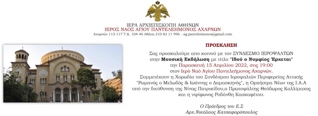 Η καθιερωμένη συναυλία του Συνδέσμου Ιεροψαλτών Περιφέρειας Αττικής «Ρωμανός ο Μελωδός & Ιωάννης ο Δαμασκηνός» θα πραγματοποιηθεί στις 15 Απριλίου 2022 ημέρα Παρασκευή και ώρα 19:00 με τίτλο «Ιδού ο Νυμφίος Έρχεται…» στον μεγαλοπρεπή Ιερό Ναό Αγίου Παντελεήμονος Αχαρνών με την 30μελή χορωδία του Συνδέσμου και την Συμφωνική Ορχήστρα της Ιεράς Αρχιεπισκοπής Αθηνών σε διεύθυνση της κ. Νίνας Πατρικίδου.