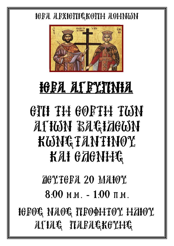 Ιερά Αγρυπνία επί τη εορτή των Αγίων Bασιλέων Κωνσταντίνου και Ελένης θα τελεστεί στον Ιερό Ναό Προφήτου Ηλιού του Δήμου Αγίας Παρασκευής, στις 20 Μαΐου, ημέρα Δευτέρα, 20:00 – 1:00πμ.