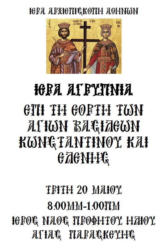 Ιερά Αγρυπνία που πραγματοποιεί ο Ιερός Ναός Προφήτου Ηλιού του Δήμου Αγίας Παρασκευής, την Τρίτη 20ή Μαΐου 2025 και ώρα 08:00 μ.μ. – 1:00 πρωινή επί τη εορτή των Αγίων Βασιλέων Κωνσταντίνου και Ελένης.