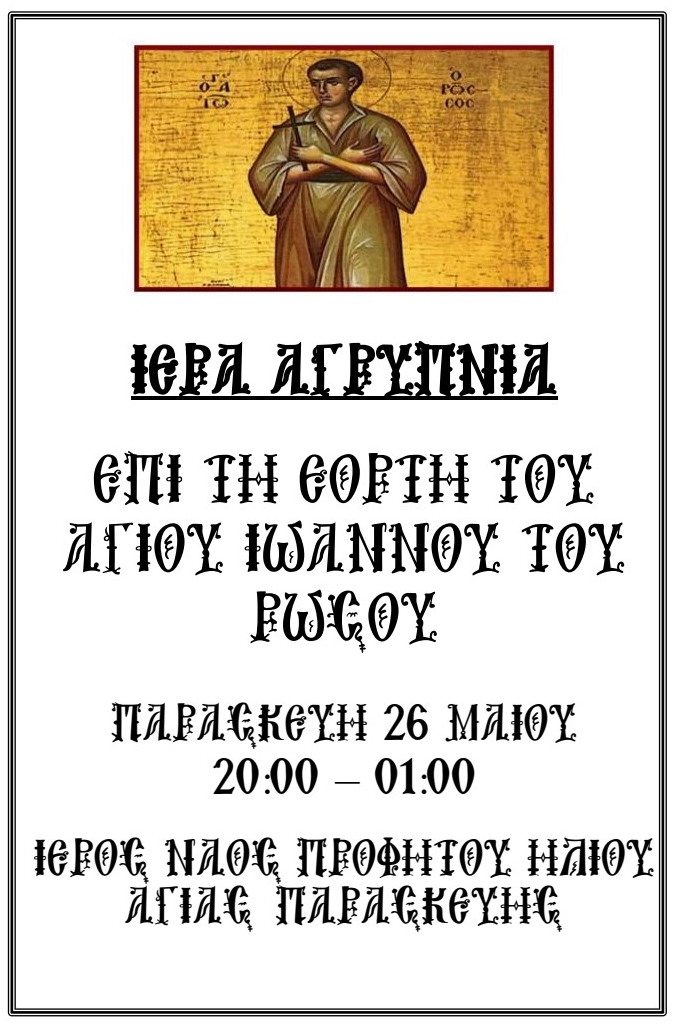 Ενορίες 23 Μαΐου, 2023 Ιερά Αγρυπνία επί τη εορτή του Αγίου Ιωάννου του Ρώσου Διαδώστε: Ιερά Αγρυπνία θα τελεστεί επί τη εορτή του Αγίου Ιωάννου του Ρώσου την Παρασεκυή 26 Μαΐου από τις 20.00 έως τη 01.00, στον Ιερό Ναό Προφήτου Ηλίου Αγίας Παρασκευής. Διαδώστε: