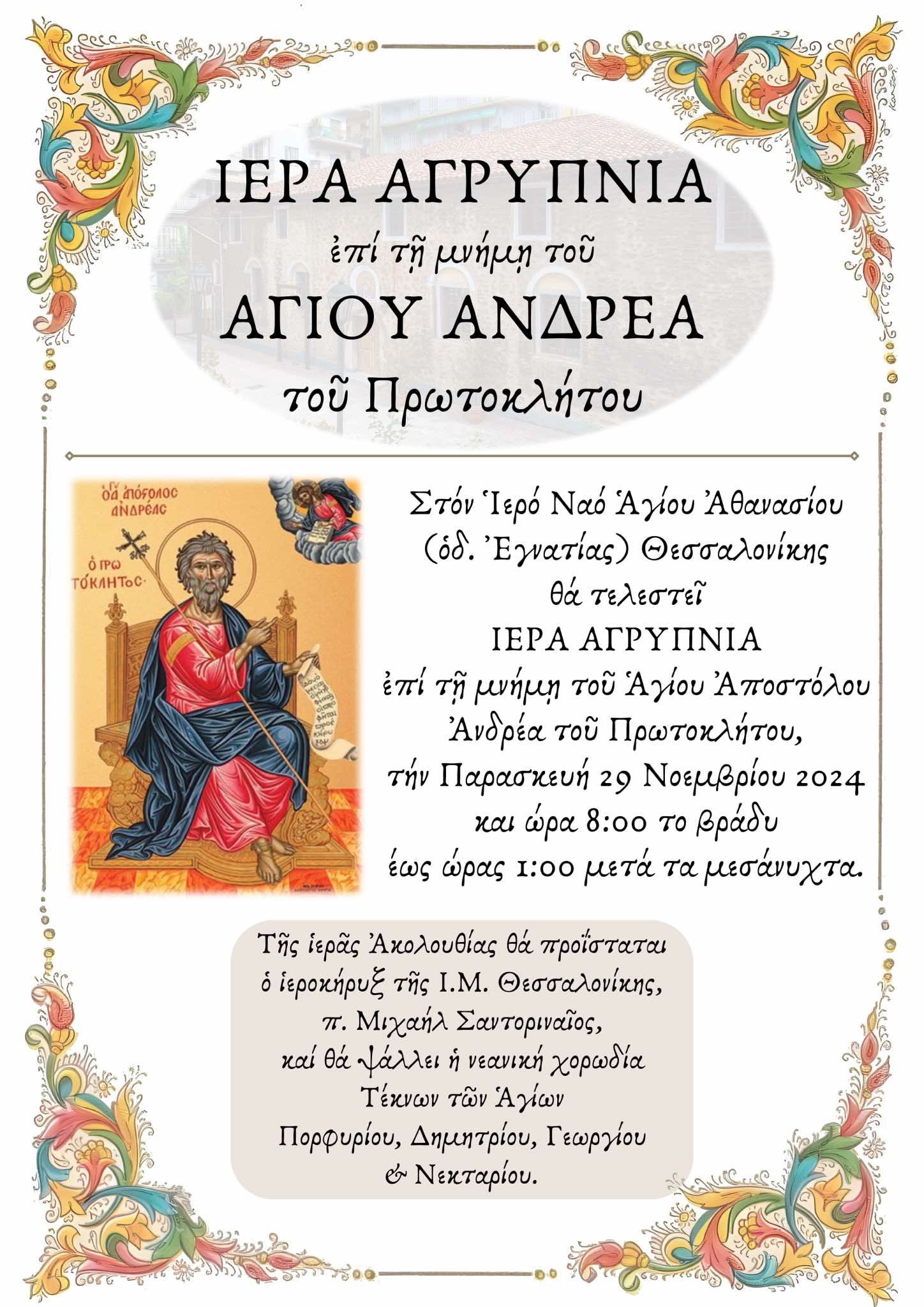 Στον Ιερό Ναό Αγίου Αθανασίου Θεσσαλονίκης θα τελεστεί Ιερά Αγρυπνία επί τη μνήμη του Αγίου Αποστόλου Ανδρέα του Πρωτοκλήτου, την Παρασκευή 29 Νοεμβρίου στις 20:00 έως τη 01:00.