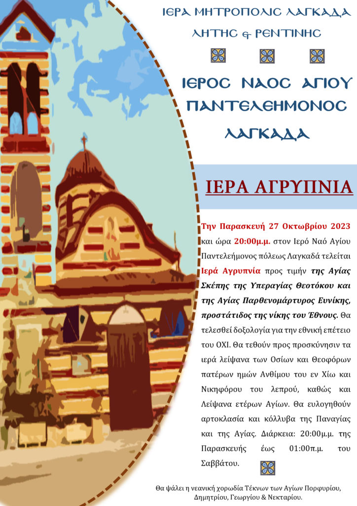 Την Παρασκευή 27 Οκτωβρίου 2023 Iκαι ώρα 20:00μ.μ. στον Ιερό Ναό Αγίου Παντελεήμονος πόλεως Λαγκαδά τελείται Ιερά Αγρυπνία προς τιμήν της Αγίας Σκέπης της Υπεραγίας Θεοτόκου και της Αγίας Παρθενομάρτυρος Ευνίκης, προστάτιδος της νίκης του Έθνους. Θα τελεσθεί δοξολογία για την εθνική επέτειο του ΟΧΙ.