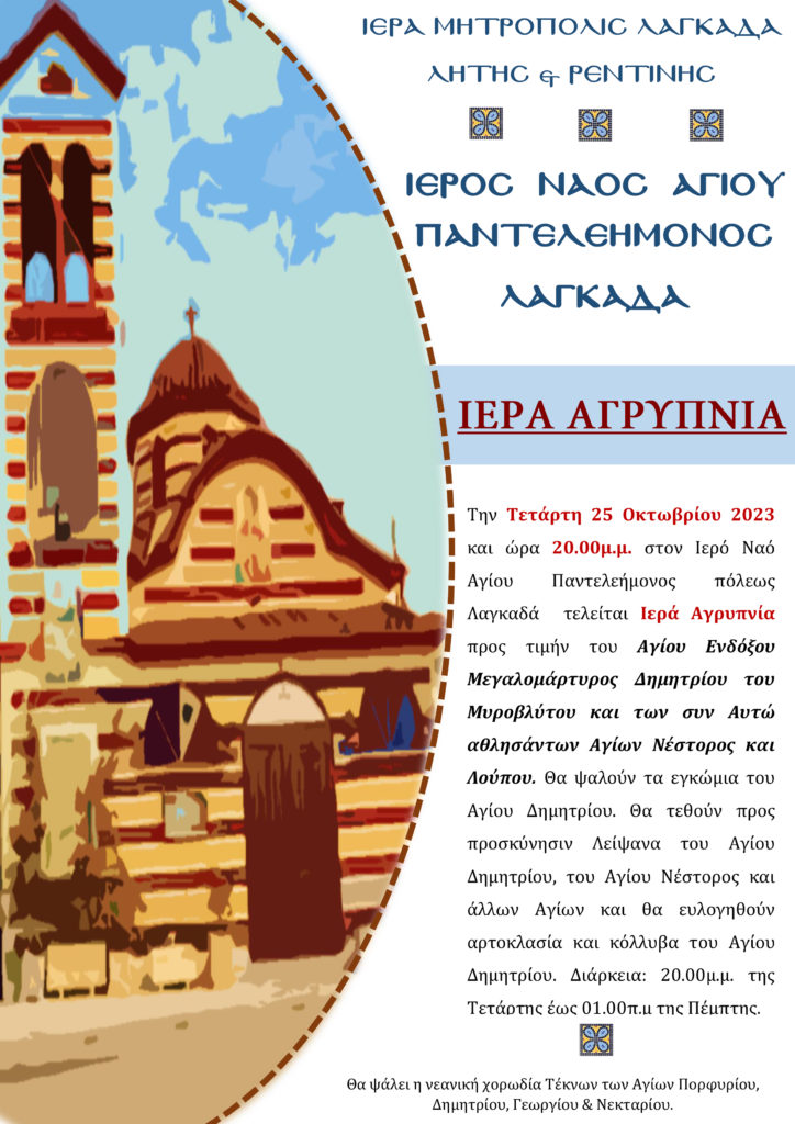 Την Τετάρτη 25 Οκτωβρίου 2023 στις 20.00 μ.μ. στον Ιερό Ναό Αγίου Παντελεήμονος πόλεως Λαγκαδά τελείται Ιερά Αγρυπνία προς τιμήν του Αγίου Ενδόξου Μεγαλομάρτυρος Δημητρίου του Μυροβλύτου και των συν Αυτώ αθλησάντων Αγίων Νέστορος και Λούπου.