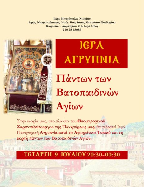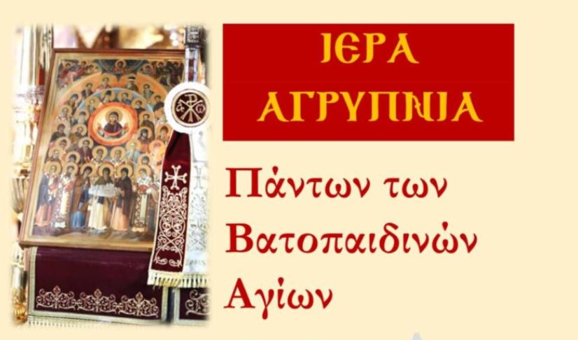 Ιερά Αγρυπνία επί τη μνήμη Πάντων των Βατοπαιδινών Αγίων θα τελεστεί στον Ιερό Μητροπολιτικό Ναό Κοιμήσεως της Θεοτόκου Χαϊδαρίου (Καραολή – Δημητρίου 2, Ιερά Οδός).