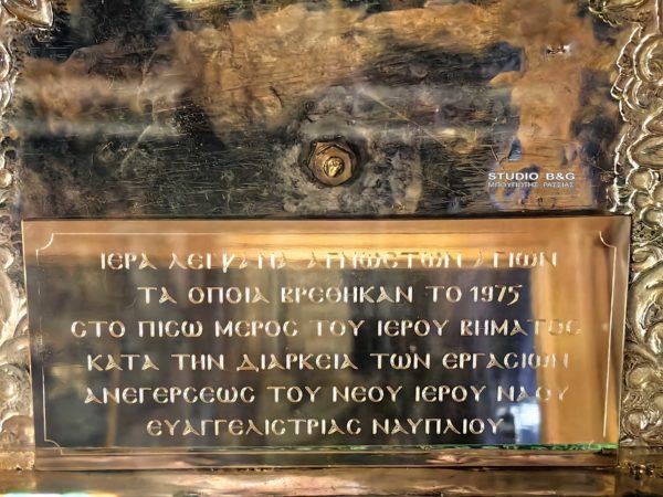 Εδώ και λίγες ημέρες έχουν τεθεί προς προσκύνηση τεμάχια ιερών Λειψάνων Αγίων στον ενοριακό ιερό ναό Ευαγγελιστρίας Ναυπλίου, Δευτέρα 16 Δεκεμβρίου. Τα Ιερά λείψανα βρέθηκαν κατά την ανακαίνιση τμήματος του ναού και αφού βρέθηκαν από δωρητές περίτεχνες λειψανοθήκες και τοποθετήθηκαν σε κεντρικό σημείο στο ναό προς προσκύνηση.