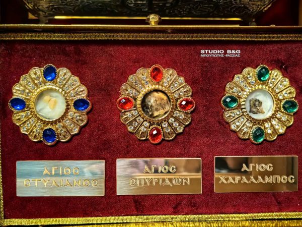 Τα ιερά λείψανα των Αγίων Ελευθερίου, Γεωργίου, Στυλιανού Χαραλάμπου, Αγίου Σπυρίδωνα, Αγίου Μεδίκου, Αγίου Λεωνίδη, Αγίου Φωκά, Αγίας Πελαγίας, Αγίου Κοσμά του Βατοπαιδινού, Αγίου Λαζάρου και αρκετών άλλων Αγίων που δεν έχουν σωθεί τα ονόματα τους, θα κοσμούν μόνιμα το ναό και θα είναι προς προσκύνηση για τους πιστούς οποιαδήποτε στιγμή επισκεφτούν ή εκκλησιαστούν στο ναό.