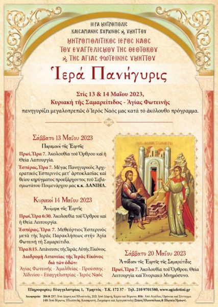 Στις 13 και 14 Μαΐου 2023 Κυριακή της Σαμαρείτιδος – Αγίας Φωτεινής πανηγυρίζει ο Μητροπολιτικός Ιερός Ναός του Ευαγγελισμού της Θεοτόκου και της Αγίας Φωτεινής Υμηττού.