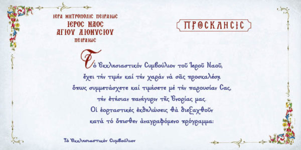 Ιερά Πανήγυρις Αγίου Διονυσίου Αρεοπαγίτου Πειραιώς – Το πρόγραμμα