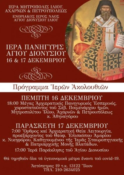 Ιερά πανήγυρις στον Ενοριακό Ναό Αγίου Διονυσίου Ιλίου διοργανώνει η Ιερά Μητρόπολη Ιλίου, Αχαρνών και Πετρουπόλεως την περίοδο 16 και 17 Δεκεμβρίου.