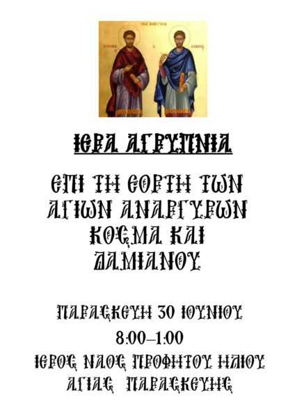 Ώρα 7.00 μ.μ. Μεθέορτος Εσπερινός και Ιερά Παράκλησις προς τους Αγίους ενδόξους Αναργύρους, Κοσμά και Δαμιανό.