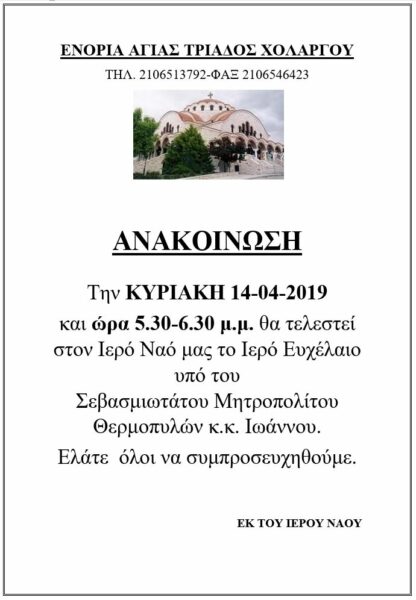 Ιερό Ευχέλαιο θα τελεσθεί στον Ιερό Ναό Αγίας Τριάδος Χολαργού, κατά την Κυριακή 14 Απριλίου 2019, υπό του Σεβασμιωτάτου Μητροπολίτου Θερμοπυλών, κ.κ. Ιωάννου, ώρα 5.30 με 6.30 μ.μ.