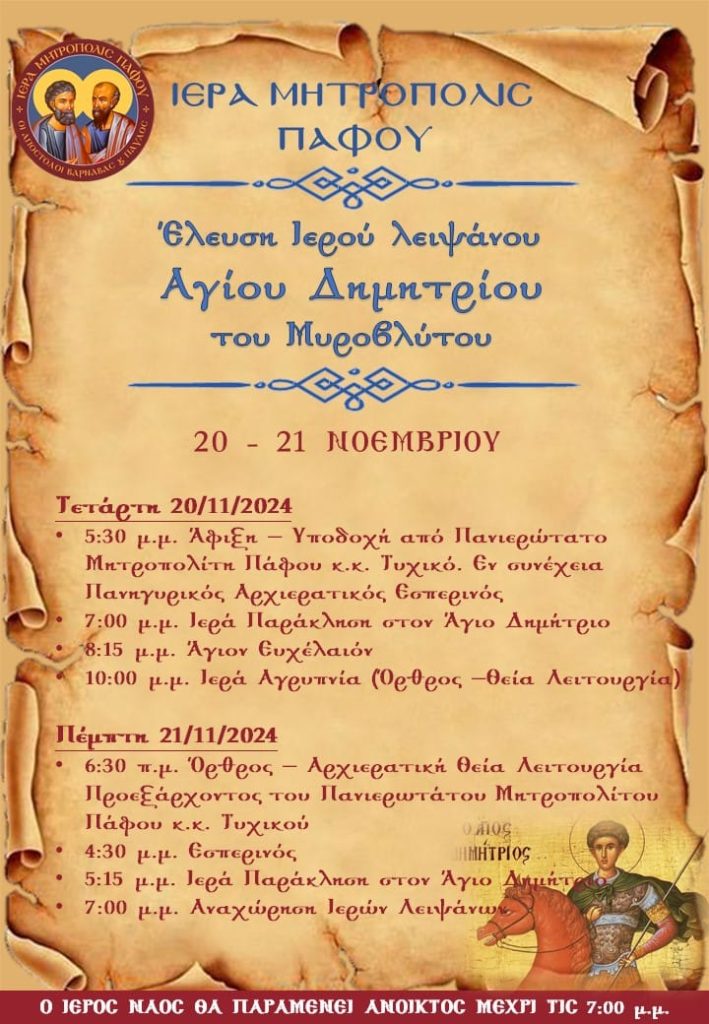 Σύμφωνα με ανακοίνωση της Ιεράς Μητρόπολης Πάφου, το απόγευμα της Τετάρτης (20/11) ο Πανιερώτατος Μητροπολίτης Πάφου κ. Τυχικός θα υποδεχθεί το Ιερό Λείψανο του Αγίου Δημητρίου του Μυροβλύτου. Θα ακολουθήσει Πανηγυρικός Αρχιερατικός Εσπερινός, Παράκληση, Άγιο Ευχέλαιο και Αγρυπνία.