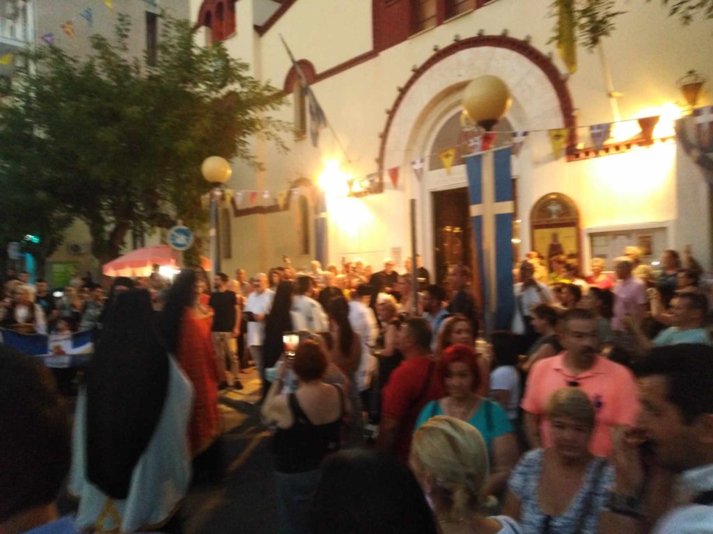 Με το πέρας της λειτουργίας, επακολούθησε εκλιτάνευση της ιεράς εικόνος της Αγίας, στους παρακείμενους δρόμους του ναού, υπο τους γλυκείς παιάνες των Φιλαρμονικών του Δήμου Αθηναίων και της Αστυνομίας – οι οποίες ευγενικά συμμετείχαν στην πανήγυρη- που προσέδωσαν ξεχωριστό χρώμα στην πομπή, αλλά και την συνοδεία παραδοσιακού χορευτικού τμήματος της Κρήτης, που λάμπρυνε και αυτό με τις ωραίες ελληνικές παραδοσιακές φορεσιές του, την ιερά λιτανεία. Σε κλίμα ηθικής έξαρσης οι κάτοικοι των πολυκατοικιών, στους δρόμους της πομπής, για την άχραντη μνήμη της Παρθενομάρτυρος Μαρκέλλας, που έραιναν ένδακρεις την σεπτή εικόνα της, με μύρα και ροδοπέταλα. Είναι στιγμές που εγγίζει κανείς τα ακένωτα κοιτάσματα ευσέβειας του χριστιανικού λαού μας και πείθεται, ότι ο ευλογημένος από τον Χριστό, λαός των Ελλήνων, δεν θα πέσει ποτέ και με τίποτα.
