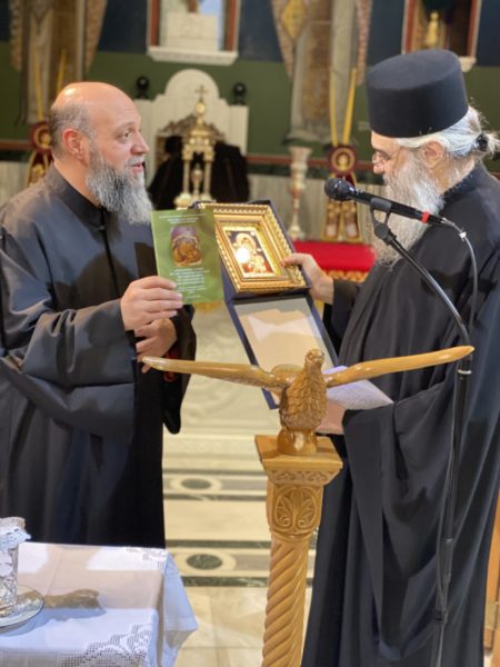 Ο π. Χριστόδουλος του προσέφερε αντίγραφο της Παναγίας της Παρηγορητρίας εκ μέρους του Εκκλ. Συμβουλίου αλλά και όλης της Ενορίας καθώς και το νέο «Παρακλητικό Κανόνα εις την Παναγίαν την Παρηγορήτριαν την Δακρυρροούσαν και Μυροβλύζουσαν» ποίημα του Σεβασμιωτάτου Μητροπολίτη Εδέσσης κ. Ιωήλ.