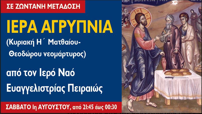 Η Ενορία της Ευαγγελιστρίας Πειραιώς θα μεταδώσει διαδικτυακά και μέσω της ιστοσελίδας www.enoriaendrasei.gr την Ιερά Αγρυπνία (Όρθρος και Θεία Λειτουργία), που θα τελεστεί ξημερώνοντας η Κυριακή (Η´ Ματθαίου – Θεοδώρου νεομάρτυρος) 1η Αυγούστου, μεταξύ 21.45 και 0.30.