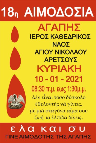 18η αιμοδοσία αγάπης Ιερού Καθεδρικού Ναού Αγίου Νικολάου Καλαμαριάς, κατά την Κυριακή 10/01/2021 από τις 8:30 έως και 13:30.