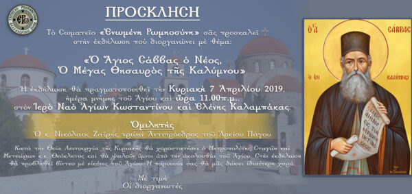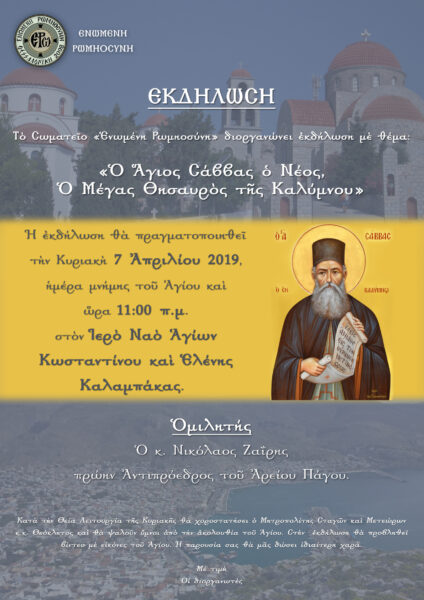 Το Σωματείο ΕΝΩΜΕΝΗ ΡΩΜΙΟΣΥΝΗ διοργανώνει Εκδήλωση με θέμα “Ο Άγιος Σάββας ο Νέος, ο Μέγας Θησαυρός της Καλύμνου”. Η εκδήλωση θα πραγματοποιηθεί την Κυριακή 7 Απριλίου 2019, ημέρα μνήμης του Αγίου και ώρα 11.00 π.μ. στον Ιερό Ναό Αγίων Κωνσταντίνου και Ελένης Καλαμπάκας. Ομιλητής ο κ. Νικόλαος Ζαϊρης, πρώην Αντιπρόεδρος του Αρείου Πάγου.