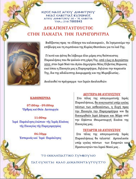 Έχοντας λοιπόν το καθήκον και την ανάγκη απόδοσης της ευχαριστίας και της ευγνωμοσύνης μας στο Πανάγιο Πρόσωπό Της, θα τιμήσουμε με όλη μας την καρδιά και τη διάνοια την Παναγία Μητέρα του Θεού μας κατά το μήνα Αύγουστο, ξεκινώντας από τις θεόπνευστες Παρακλήσεις, τη Μεγάλη και τη Μικρή, για το πρώτο δεκαπενθήμερο, όπως άλλωστε προβλέπεται από την παράδοση της Εκκλησίας μας. Εξυπακούεται ότι κάθε πρωί, θα τελείται Θεία Λειτουργία 7:00-9:00 και στις 11:00, δε θα παύσει να τελείται η καθιερωμένη Ιερά Παράκληση στην Παναγία την Παρηγορήτρια όπως φαίνεται και στο επισυναπτόμενο Πρόγραμμα Ιερών Ακολουθιών.
