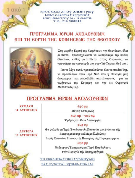 Έχοντας λοιπόν το καθήκον και την ανάγκη απόδοσης της ευχαριστίας και της ευγνωμοσύνης μας στο Πανάγιο Πρόσωπό Της, θα τιμήσουμε με όλη μας την καρδιά και τη διάνοια την Παναγία Μητέρα του Θεού μας κατά το μήνα Αύγουστο, ξεκινώντας από τις θεόπνευστες Παρακλήσεις, τη Μεγάλη και τη Μικρή, για το πρώτο δεκαπενθήμερο, όπως άλλωστε προβλέπεται από την παράδοση της Εκκλησίας μας. Εξυπακούεται ότι κάθε πρωί, θα τελείται Θεία Λειτουργία 7:00-9:00 και στις 11:00, δε θα παύσει να τελείται η καθιερωμένη Ιερά Παράκληση στην Παναγία την Παρηγορήτρια όπως φαίνεται και στο επισυναπτόμενο Πρόγραμμα Ιερών Ακολουθιών.