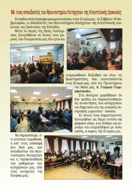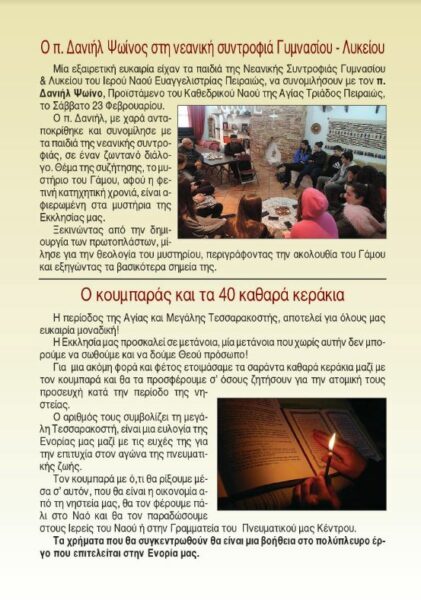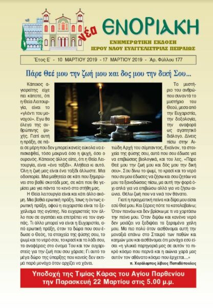 Κυκλοφόρησε η εβδομαδιαία “ΝΕΑ ΕΝΟΡΙΑΚΗ” (10-17 Μαρτίου 2019) της Ενορίας Ιερού Ναού Ευαγγελίστριας Πειραιώς. Μία μικρή γεύση από τις σελίδες της, ως έχουν παρακάτω: