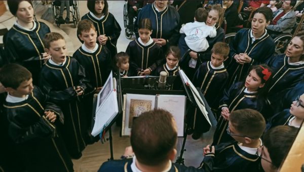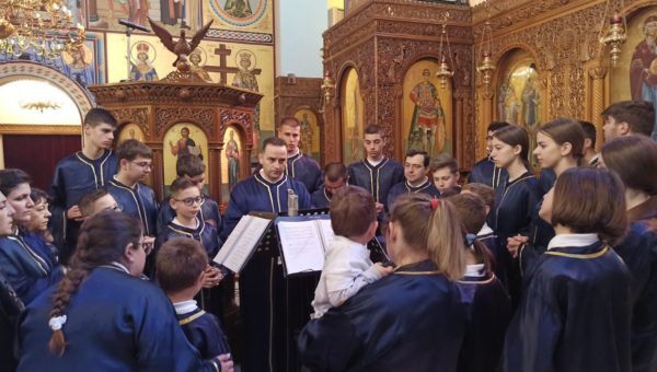 Περισσότεροι από 30 χορωδοί της Ακαδημίας Ψαλτικής Ειρμός ερμήνευσαν στο μέσον του Ναού και ενώπιον της Εικόνος της Παναγίας της Πορταϊτίσσης το «Ο Άγγελος εβόα», με το σύνολο του εκκλησιάσματος να υποψάλλει καθ’ όλη τη διάρκεια της Θείας Λειτουργίας.