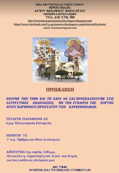Λατρευτικές εκδηλώσεις προς τιμή του Αγίου Παρθενίου προστάτου  των καρκινοπαθών θα πραγματοποιηθούν στον Ιερό Ναό Αγίου Ιωάννου Σεπολίων της Ιεράς Μητρόπολης Περιστερίου.